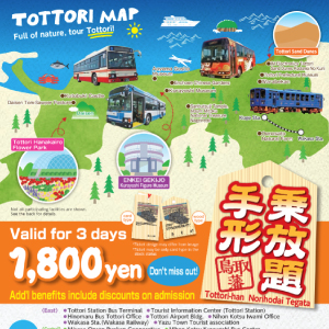 Osaka Namba~Tottori Station (Nihon Kotsu Highway Bus) : Approx. 3hr min./Kurayoshi Station (Nihon Kotsu Highway Bus) : Approx. 3hr 30 min./Yonago Station (Nihon Kotsu Highway Bus) : Approx. 3hr 30 min.